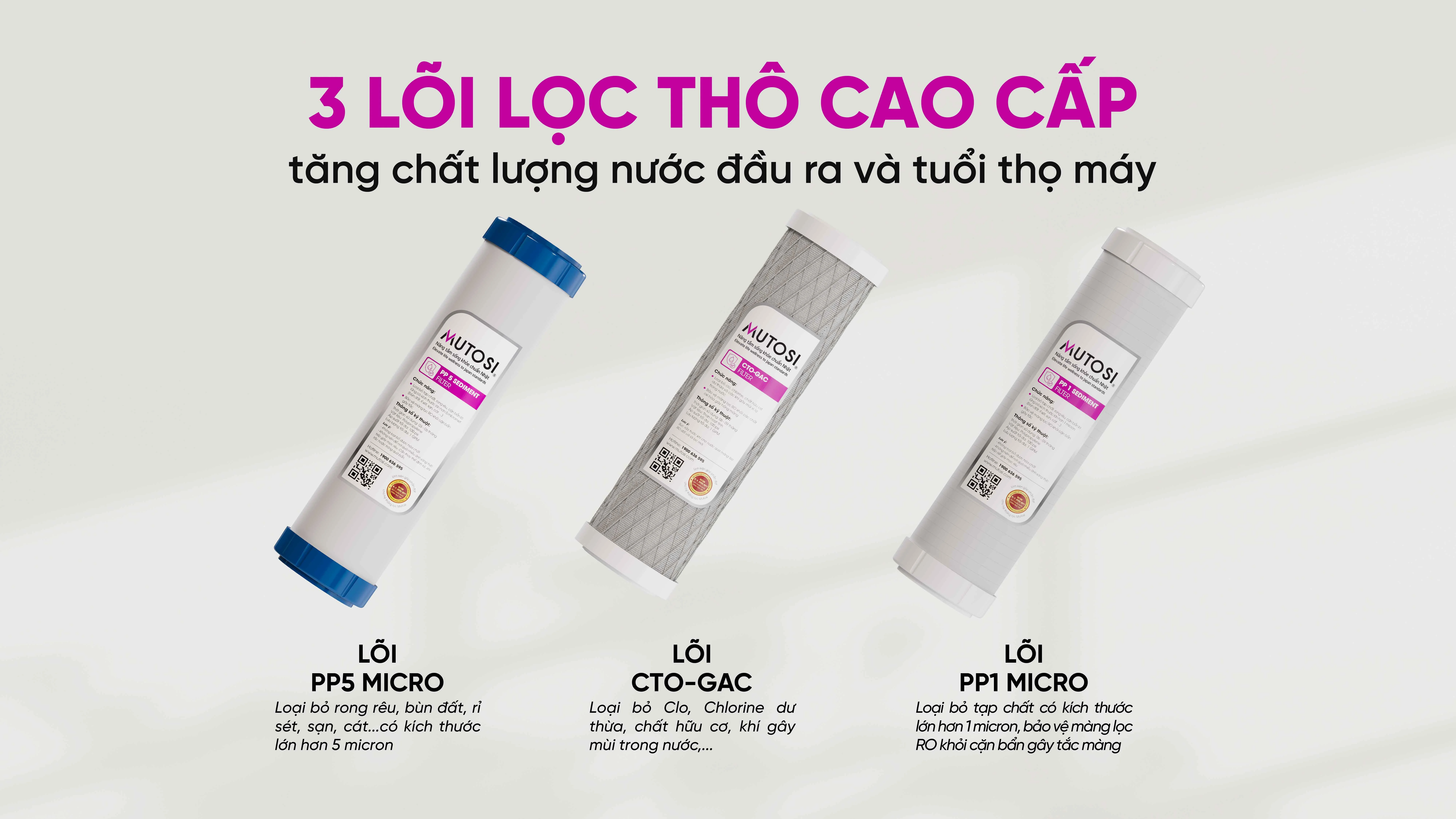 Nguồn nước đầu vào nếu không được xử lý tốt sẽ nhanh chóng làm giảm hiệu suất và tuổi thọ của toàn bộ hệ thống lọc. MP-S99 trang bị bộ 3 lõi lọc thô giúp loại bỏ tạp chất ngay từ đầu, đảm bảo nền nước sạch trước khi lọc sâu.