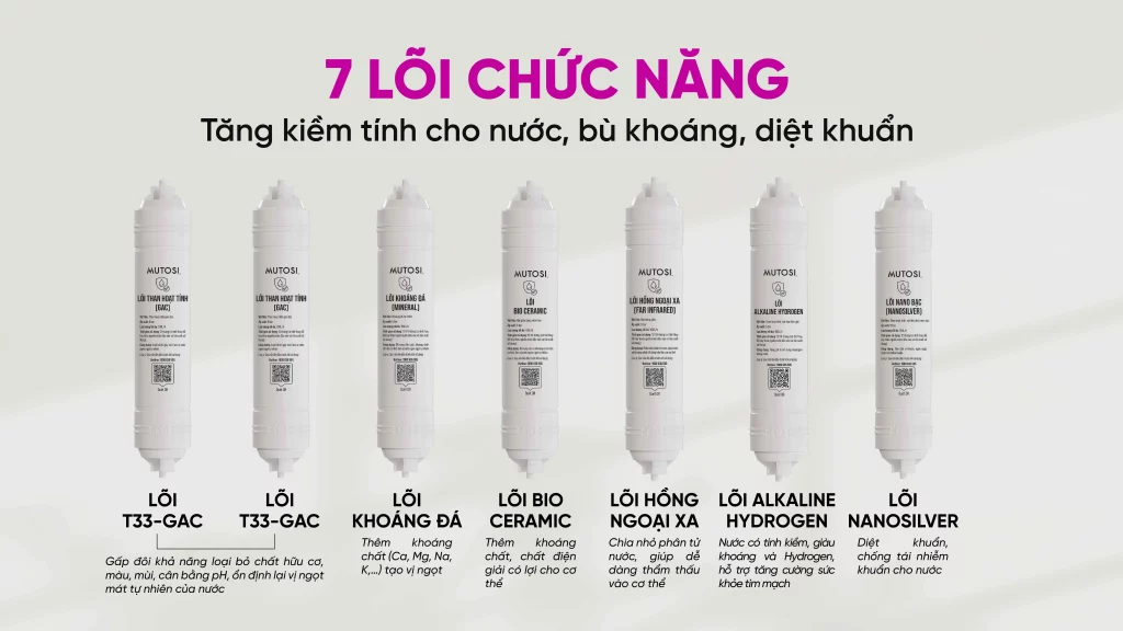 - 7 lõi chức năng: gồm T33-GAC (x2), khoáng đá, Bio Ceramic, hồng ngoại xa, Alkaline Hydrogen, Nano bạc