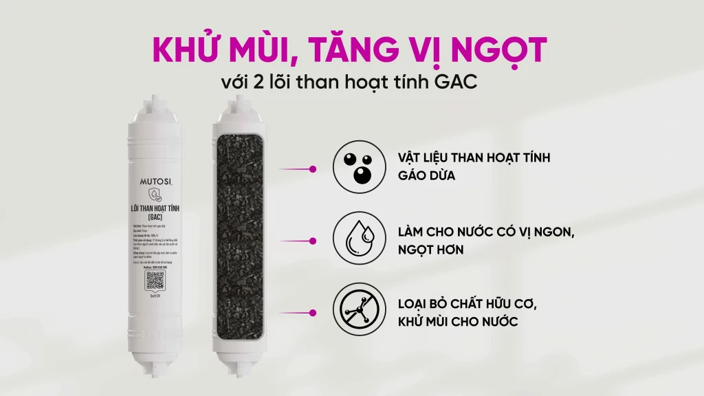 Nước sạch nhưng còn mùi hoặc vị ngang sẽ khiến trải nghiệm sử dụng không trọn vẹn. MP-S99 khắc phục triệt để điều này bằng việc trang bị 2 lõi GAC-T33, giúp xử lý mùi và cải thiện vị nước rõ rệt ngay tại đầu ra.