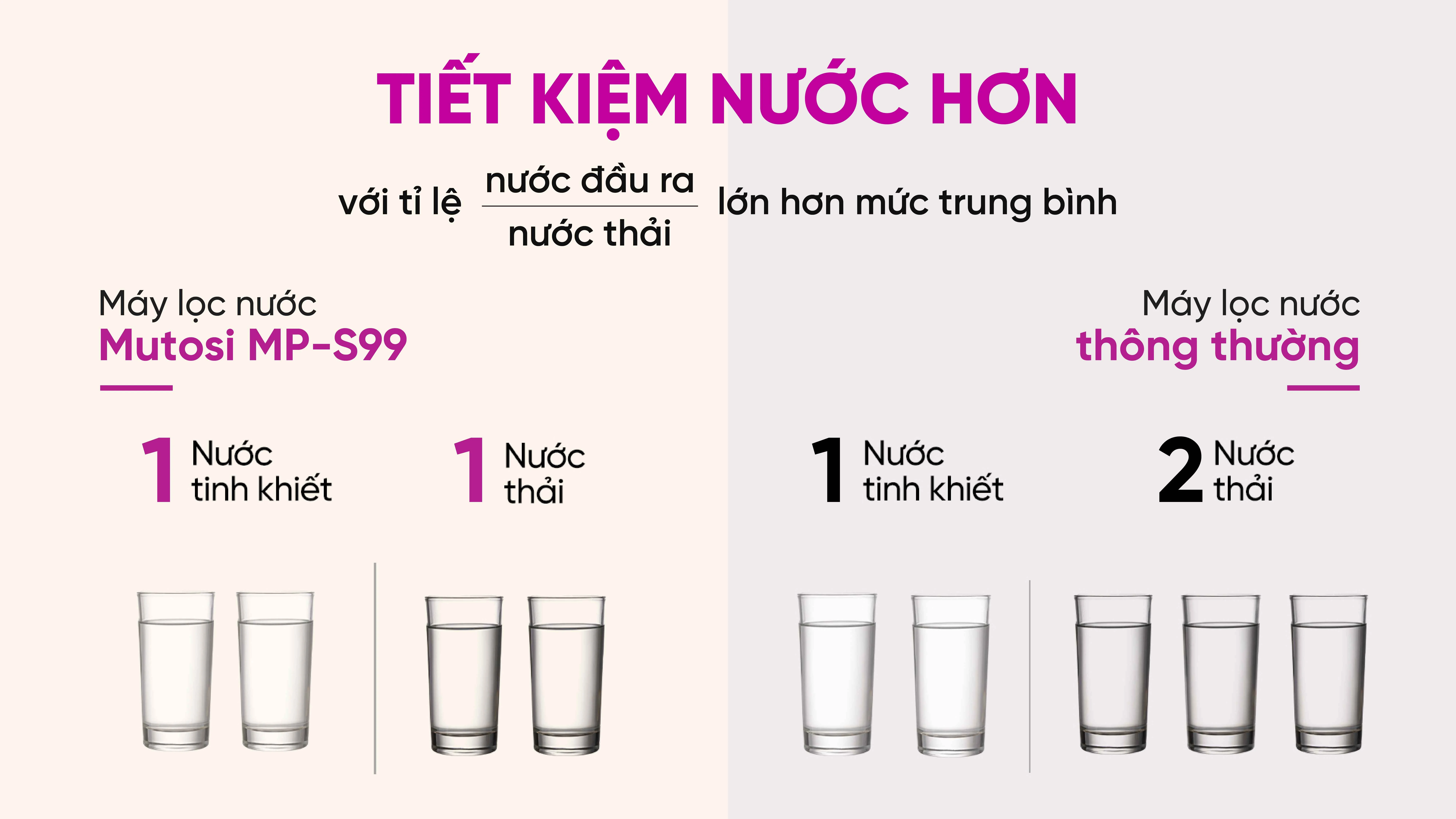 Nhờ hiệu suất cải tiến, để có 2 cốc nước tinh khiết, MP-S99 chỉ cần thải 2 cốc nước – giảm đáng kể hao phí so với các dòng máy lọc thông thường. Đây là lựa chọn thông minh cho gia đình muốn vừa sạch vừa tiết kiệm.