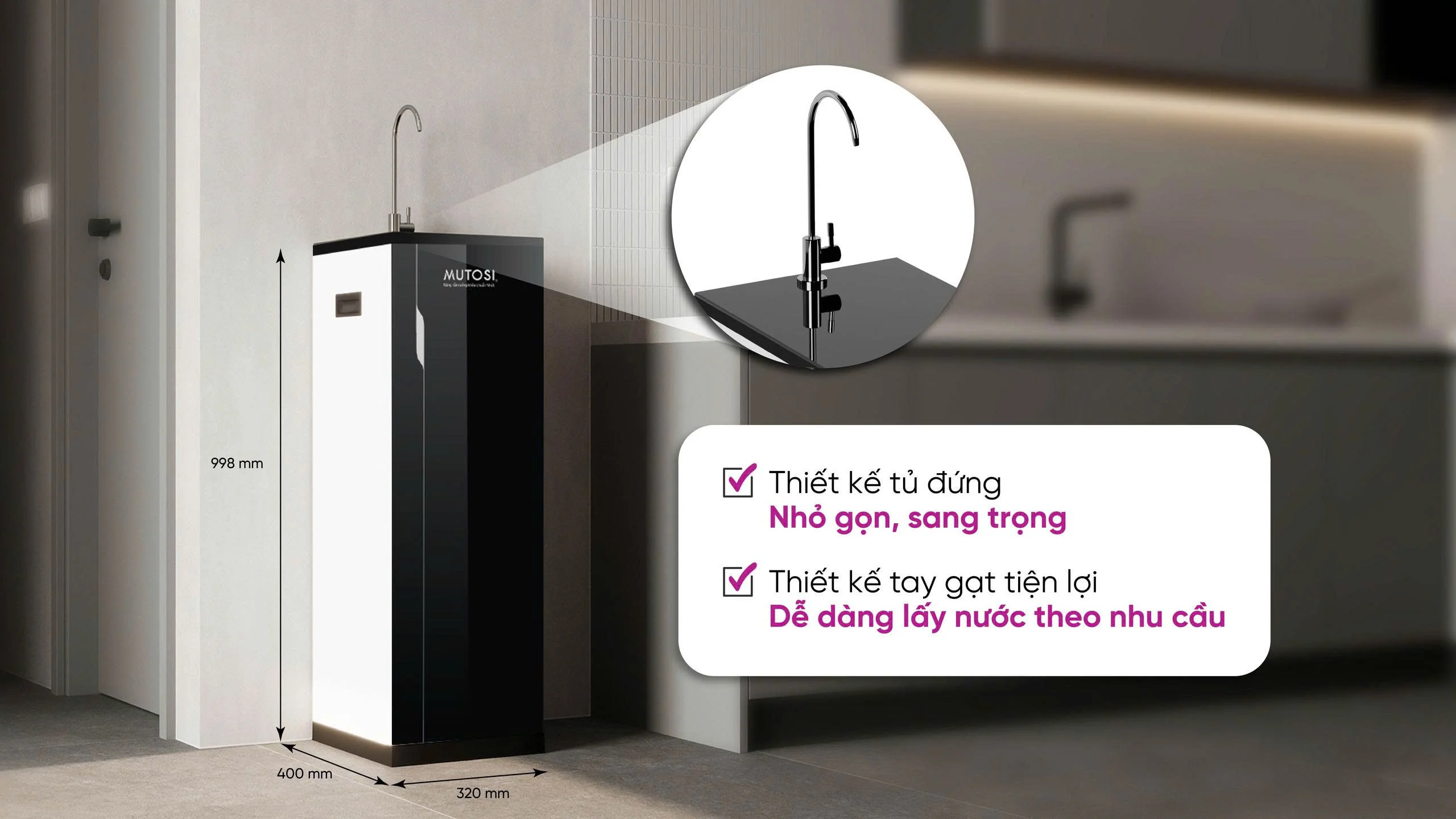 Với thiết kế tối ưu, MP-S99 không chỉ là thiết bị lọc nước mà còn là giải pháp tiện nghi, giúp không gian luôn ngăn nắp và thẩm mỹ.