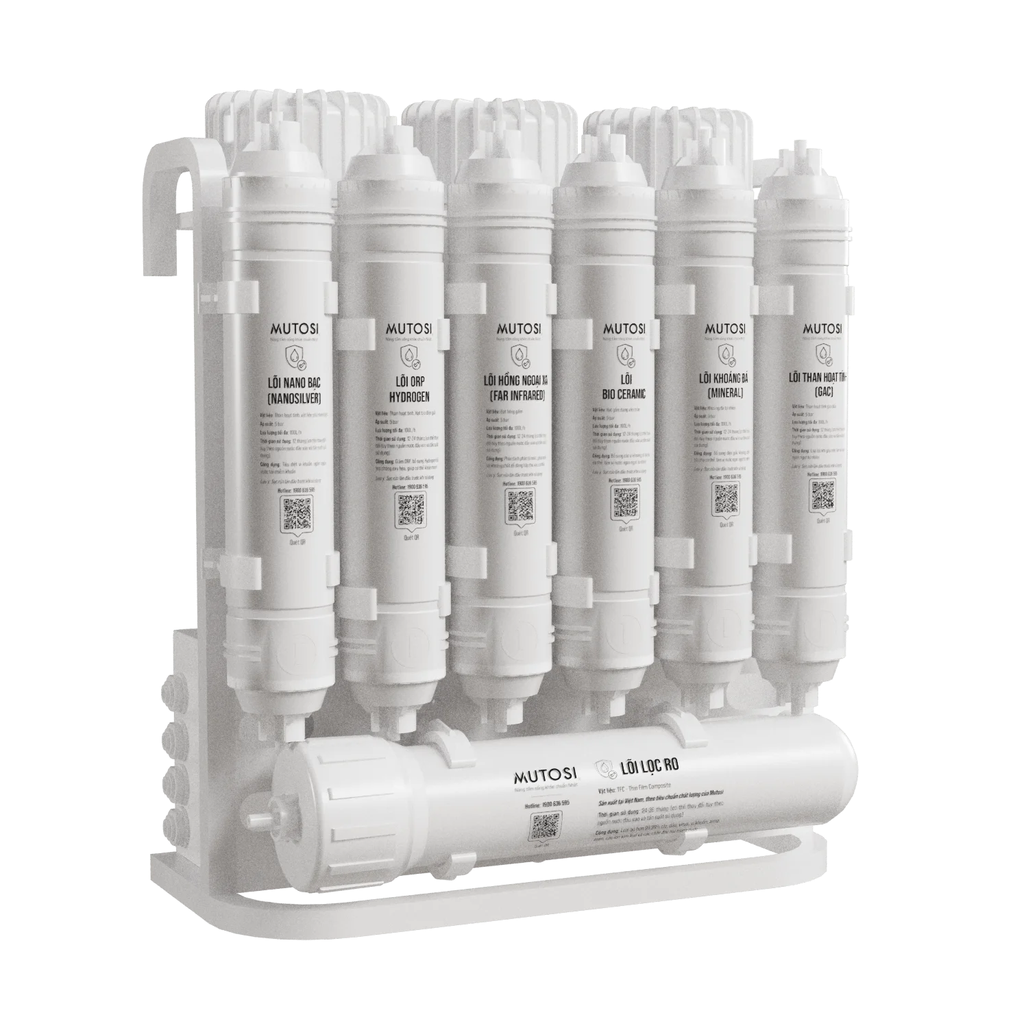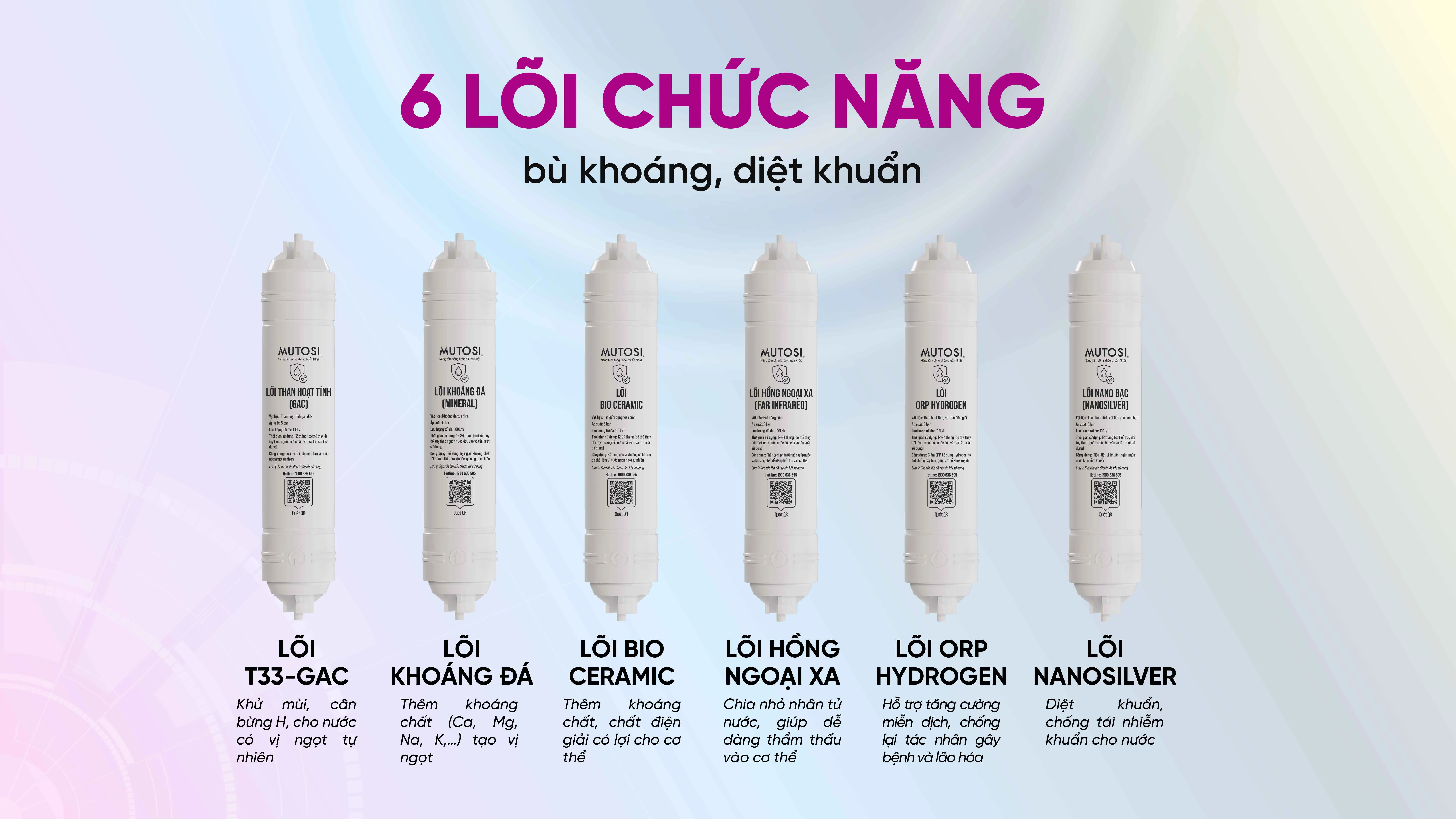 Sau khi được lọc sạch bằng màng RO, nước gần như tinh khiết tuyệt đối nhưng cũng mất đi một phần khoáng tự nhiên cần thiết. Mutosi MP-U66 tiếp tục xử lý giai đoạn sau lọc bằng 6 lõi chức năng chuyên sâu, giúp cân bằng lại chất lượng nước theo hướng “tốt cho cơ thể – dễ uống mỗi ngày”.