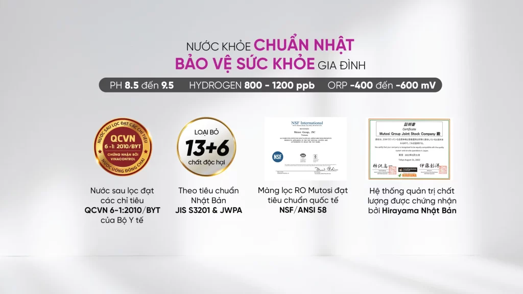 Sự kết hợp giữa tiêu chuẩn Việt Nam – Nhật Bản – Quốc tế giúp sản phẩm đảm bảo từ công nghệ đến quy trình sản xuất. Kết quả cuối cùng là nguồn nước không chỉ sạch, mà còn đạt chuẩn an toàn toàn diện cho sức khỏe lâu dài.