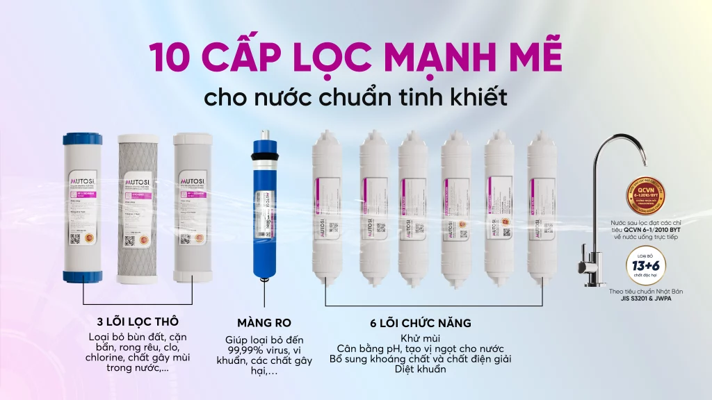 - Màng RO Mutosi: loại bỏ 99,99% virus, vi khuẩn, asen, chì, thủy ngân