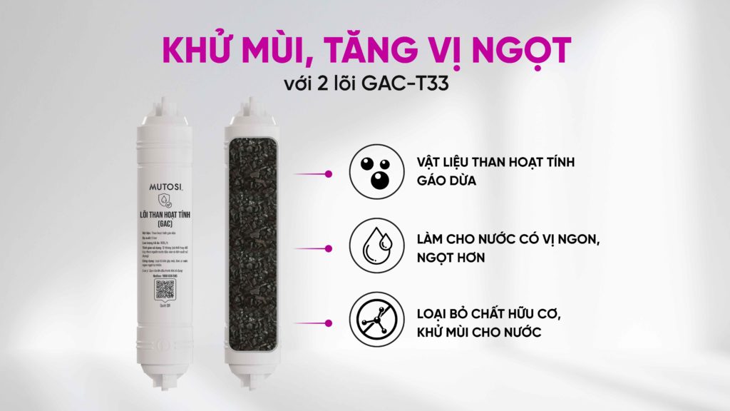 - 2 lõi T33-GAC: tăng gấp đôi hiệu quả khử mùi, loại bỏ chất hữu cơ, cân bằng pH, tạo vị ngọt tự nhiên